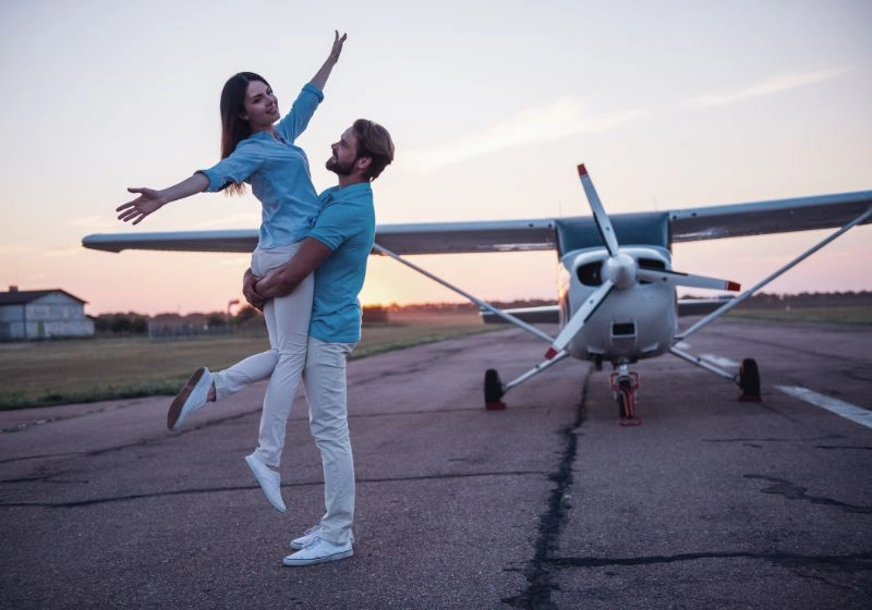 Ideální doba pro romantický let je před západem slunce, kdy je obloha nejkrásnější. Z kokpitu letadla je to ještě hezčí pohled než ze země!